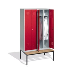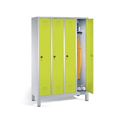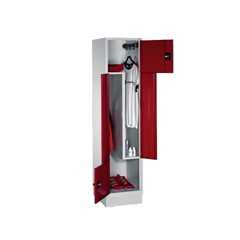 Dieser Spint für den Rettungsdienst zeichnet sich durch ein Achsmaß von 40 cm oder 50 cm aus. Auf dem Schrankdach befindet sich ein Helmhalter, darunter optional eine Wertfachtür mit Einwurfschlitz. Der Bereich für die Kleidung bleibt in der Regel offen, damit eine optimale Belüftung stattfindet und der Nutzer sich ohne Zeitverlust umkleiden kann. Optional ist je nach Spindsystem eine Schranktür erhältlich.